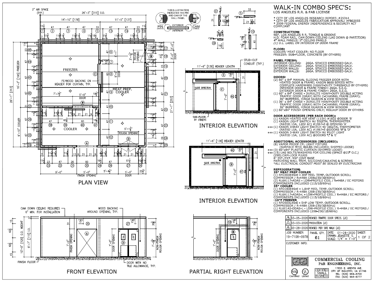 Doors: (2) 60″ x 84″ manual sliding freezers doors with heated frame; (1) 60″ x 84″ heavy-duty double acting traffic door; (1) 36″ x 84″ heavy-duty double acting traffic door.