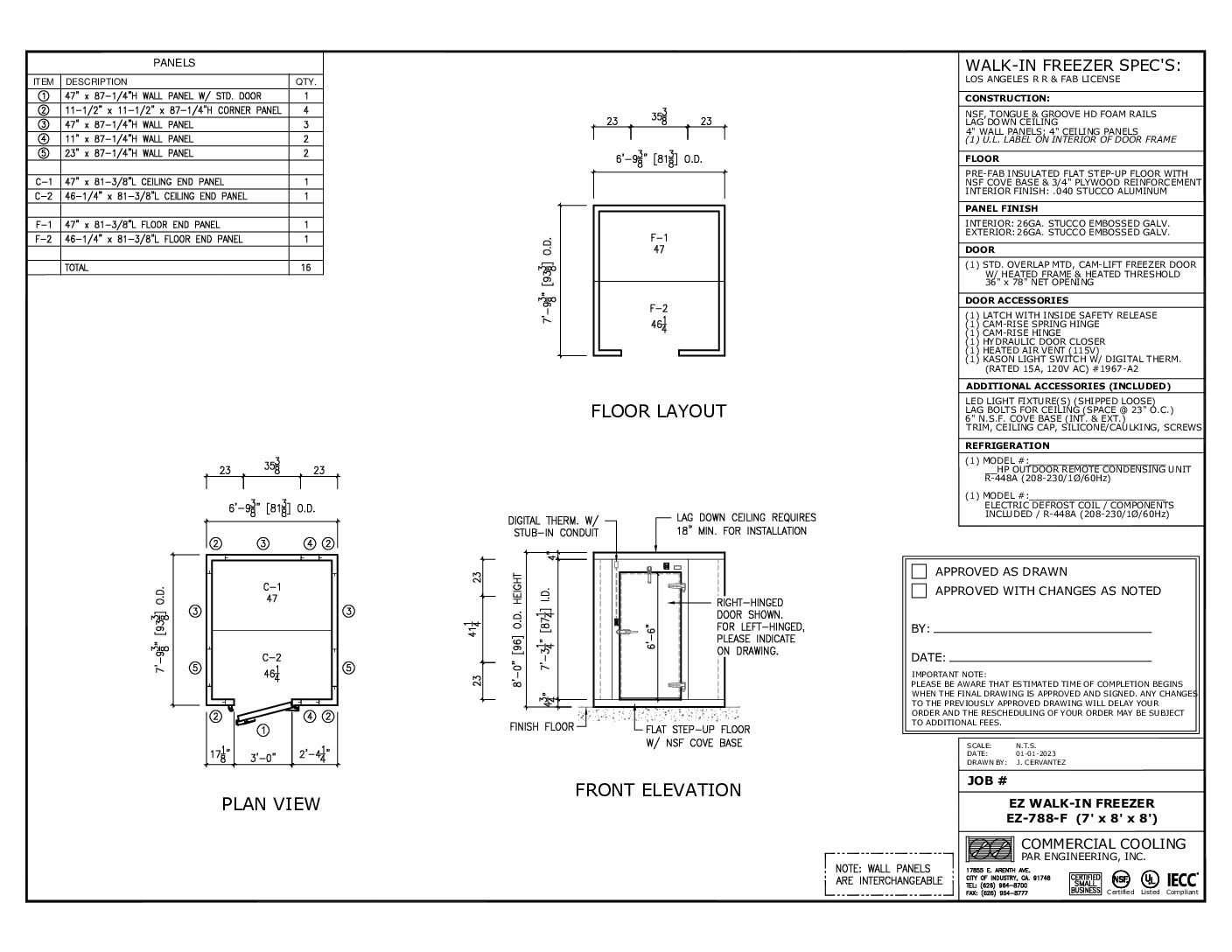 Nominal size 7’ x 9’ freezer has actual outside dimensions of 6’9” x 8’9”, door can be located as drawn or where you see #3, #4 or #5 panels. 4” thick walls and ceilings with 4-3/4” thick prefab insulated flat step-up floor with NSF cove base and 3/4″ plywood reinforcement with aluminum finish. Can be paired with Russell Refrigeration consisting of remote RFO250L condensing unit and low-profile coil RL6E066. Refrigeration is 220v 1ph or 3ph, charged with R448 refrigerant.