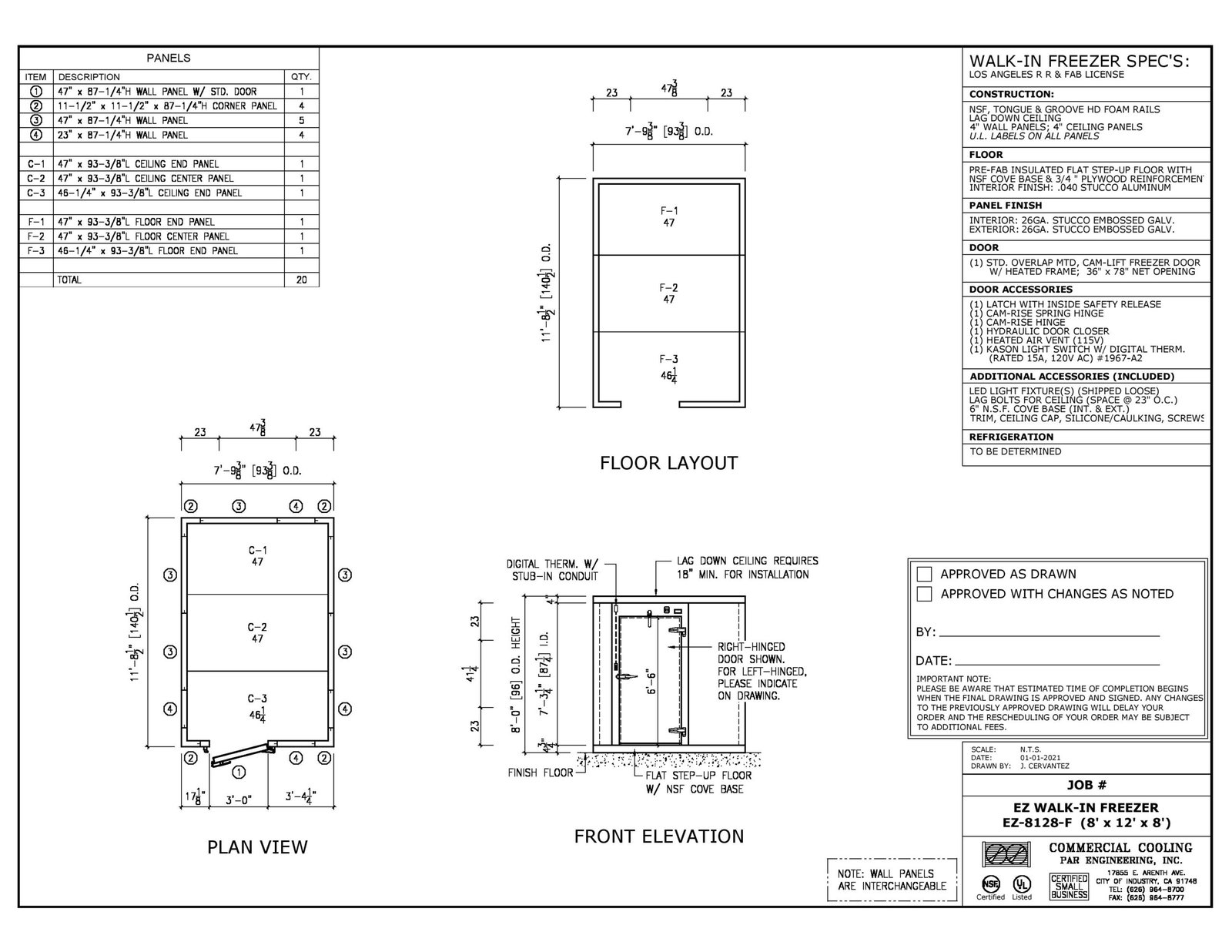 Construction: NSF; high density foam rails with tongue and groove design; panels come with NSF gaskets and cam-lock; foamed-in-place polyurethane insulation; lag down ceilings; 4″ thick wall and ceiling panels; manufactured using 100% US made materials.