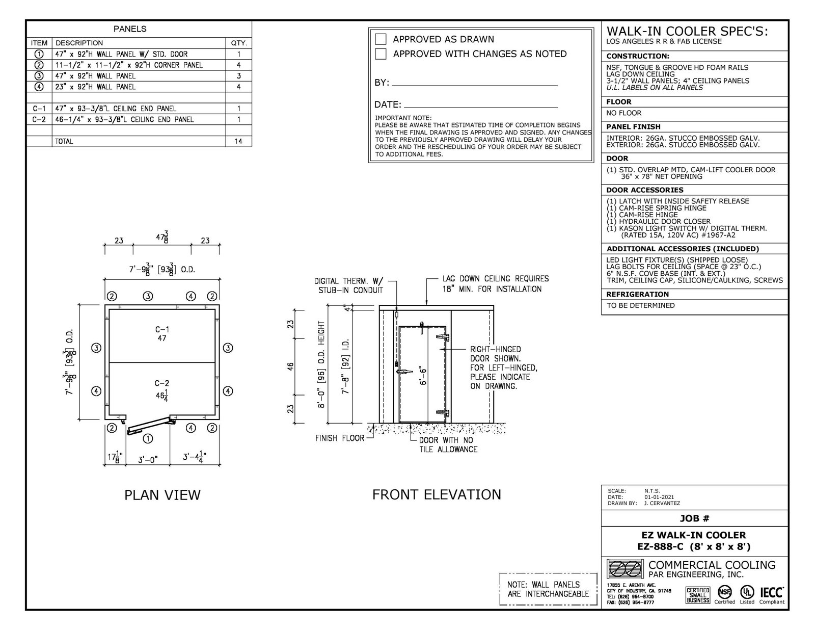 Construction: NSF certified; rails with tongue and groove design; foamed-in-place polyurethane insulation; Lag Down Ceiling; 3 1/2″ Wall Panels; 4″ Ceilings; nominal size; manufactured using 100% US made materials. No Floor. EISA compliant.